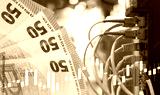 Network equipment. Euro banknotes. Money to pay for internet. Router with fiber optic wires. Graph of rising prices for internet; increasing costs for network technologies. Internet equipment