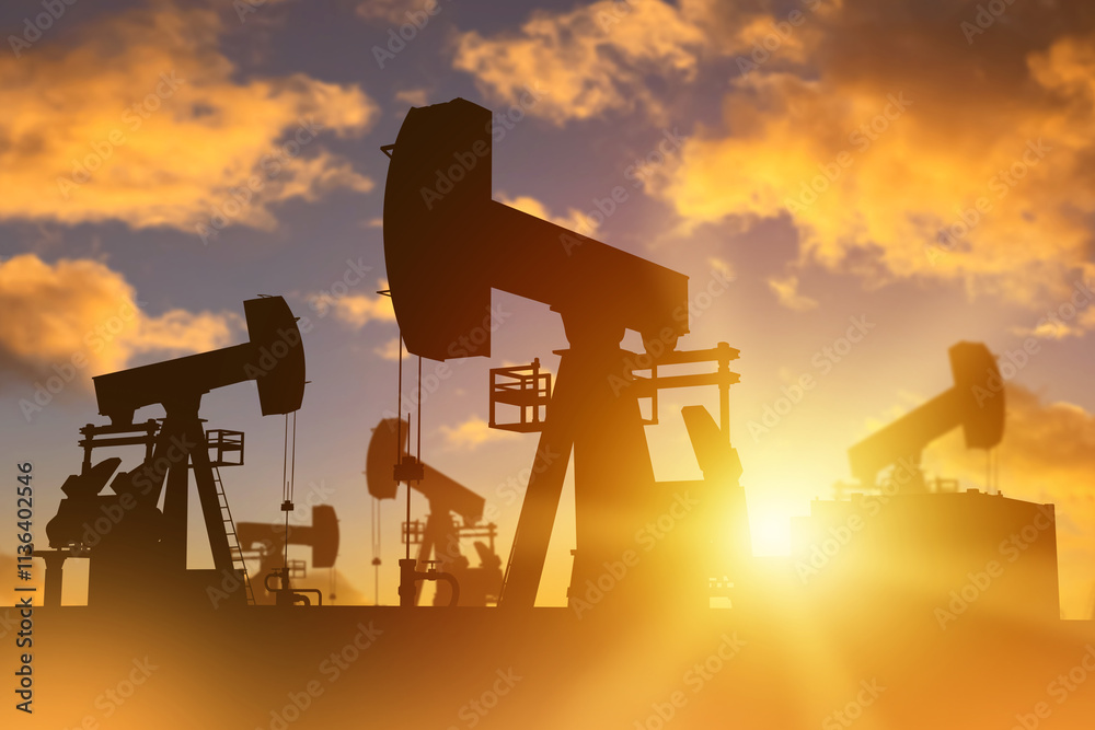 Oil field at sunset. Petroleum extraction. Silhouettes of oil pumps. Birthplace of energy resources. Hydrocarbon production. Oil pumps produce petroleum. Industrial landscape. 3d image