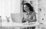 Middle Eastern Lady Using Laptop Working Online Wearing Eyewear Sitting At Workplace In Modern Office. Remote Job, Technology And Career Profession Concept. Side View