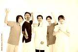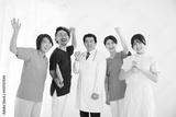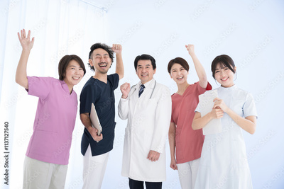 ドクターや看護師の楽しそうな転職成功などに、 横並びの医療従事者のイメージ ドクターと看護師、理学療法士チーム 水色背景
