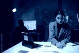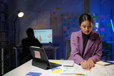 Young manager reviewing marketing data and graphs on paperwork, using tablet and computer, working overtime in startup company office