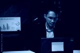 Young businessman working late at night in office using laptop, with graphs on a monitor in the background