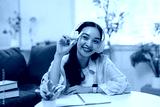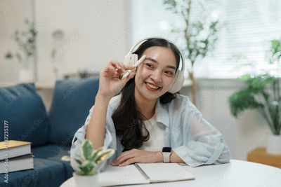 Happy student wearing headphones and holding a pen while sitting at a table with a notebook, studying remotely from home