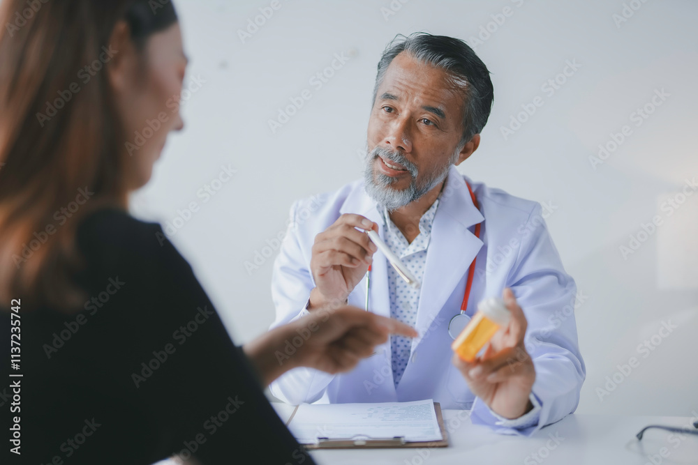 Doctor holding medicine bottle and explaining prescription to patient during medical consultation in hospital