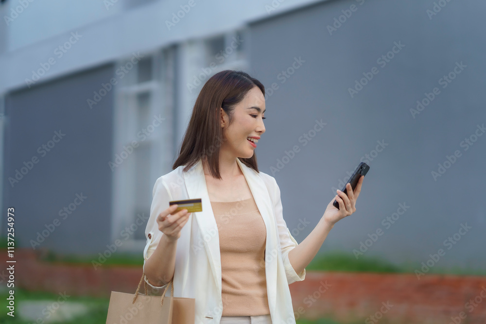 Smiling businesswoman holding shopping bag and credit card, using smartphone for online shopping