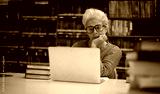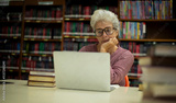 Elderly woman sitting in a library, combining traditional and modern approaches to learning or research by book and laptop computer sense of purpose dedication to personal grown concept.