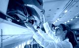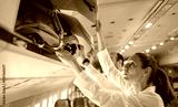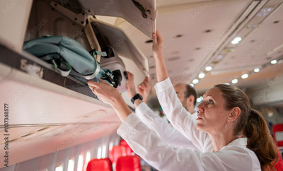 Tourist airplane placing backpack into an airplane's overhead compartment the routine process of boarding an airplane belongings before a flight is travel by plane on holiday or business trip concept.
