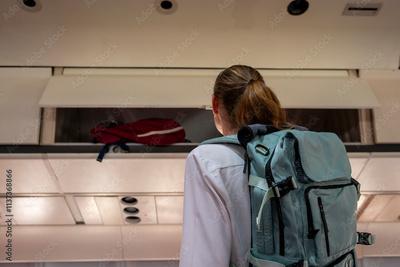 Tourist airplane placing backpack into an airplane's overhead compartment the routine process of boarding an airplane belongings before a flight is travel by plane on holiday or business trip concept.