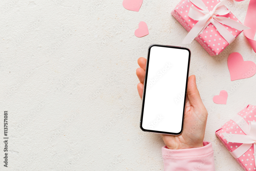 Woman hand holding mobile phone with blank screen on colored background with hearts, valentine day concept top view flat lay