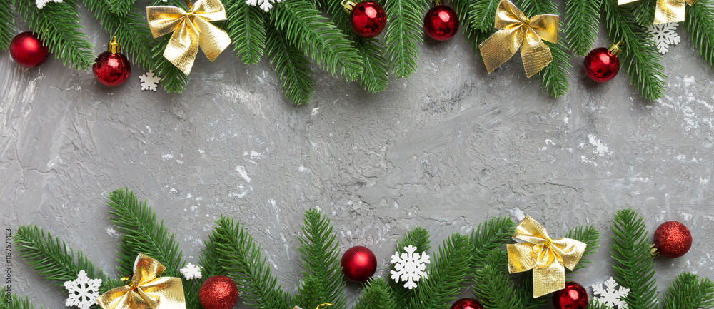 Christmas background with fir branches and Christmas decor. Top view, copy space for text