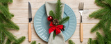 Christmas table place setting with christmas decor and plates, kine, fork and spoon. Christmas holiday background. Top view