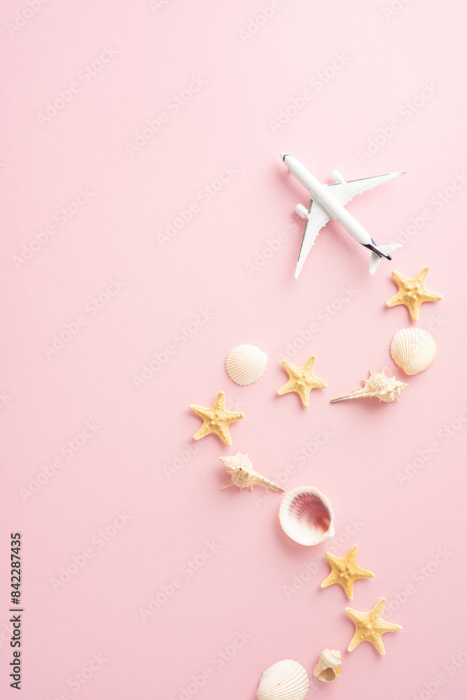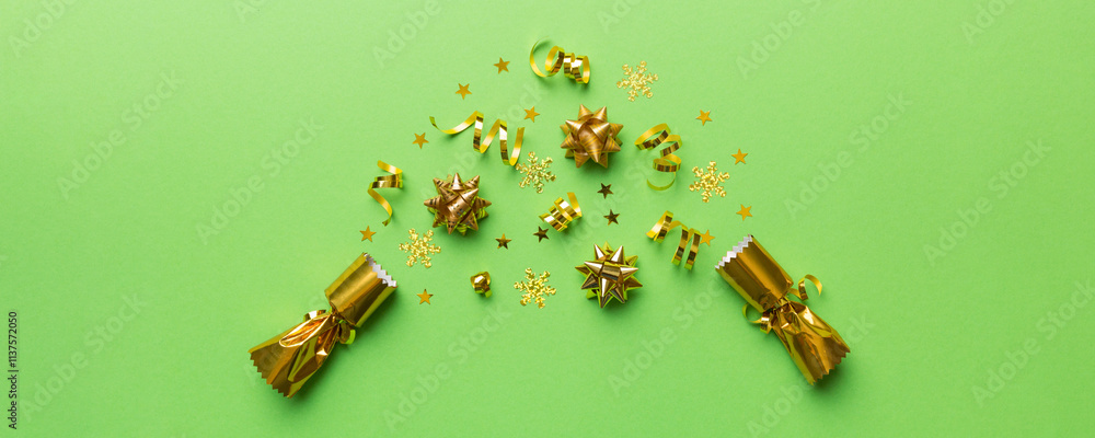 Christmas crackers with shiny confetti on color background, top view, copy space