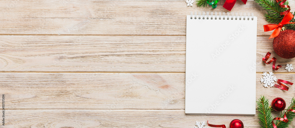 Christmas blank greeting card mock-up scene. Creative layout made of Christmas tree branches and paper card note. Flat lay. Nature New Year concept