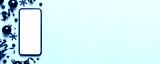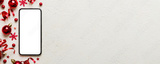 Christmas online shopping from home phone with blank white display top view. smart mobile with copy space on colored background with Christmas decorations balls,. Winter holidays sales background