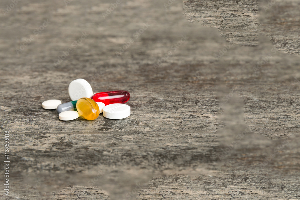 Collection Of Various Medical Tablets And Pills. Assorted pharmaceutical medicine pills, tablets and capsules on table background. Heap of assorted various medicine tablets. Health care