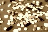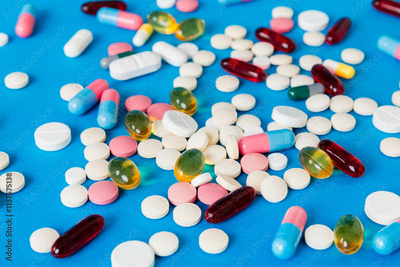 Many different colorful medication and pills perspective view. Set of many pills on colored background