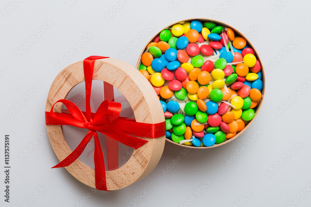 Set of different sweet candy in a paper box with a satin ribbon on a colored background. Holiday concept