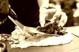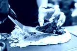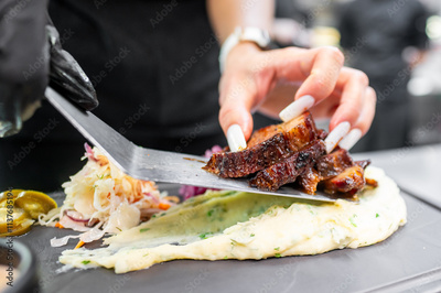 Close-up of a chef's hand carefully placing sliced grilled meat onto a bed of mashed potatoes, with a colorful slaw and garnishes, showcasing a vibrant culinary creation.