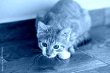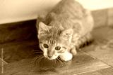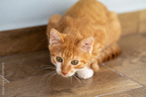 Ginger tabby little kitten look away sitting on the floor. Animal portrait. Pet. Sitting posing. Beautiful funny kitten