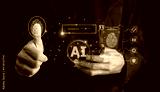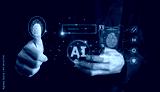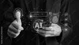 The businessman is using advanced AI technology and biometric security systems, such as fingerprint scanning, to enhance data protection and streamline digital operations.