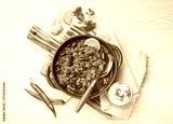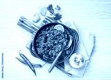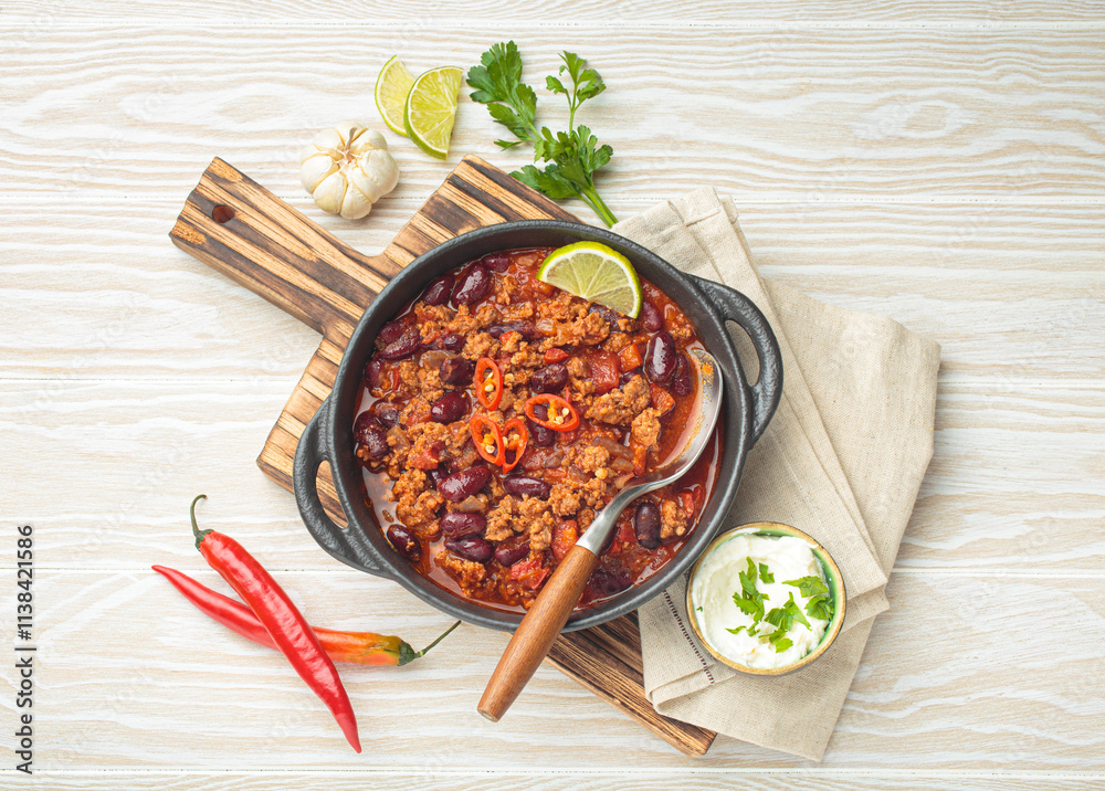 Traditional mexican chili con carne with lime, red chili peppers, and sour cream in a cast iron pan on a wooden board, white background
