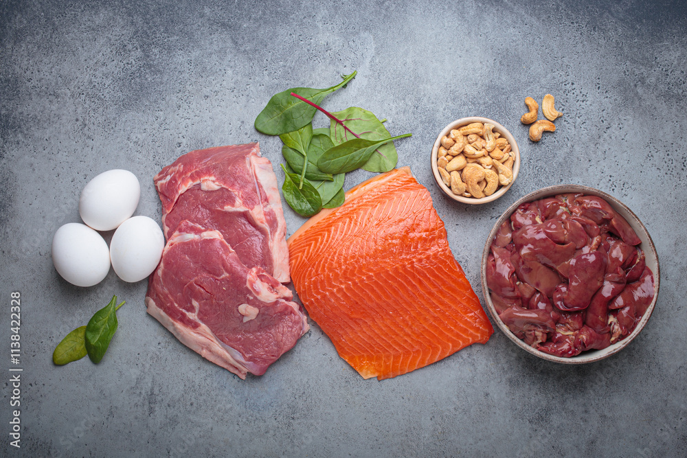 Fresh salmon fillet, raw beef, nutritious eggs, spinach, nuts cashews and liver arranged on a gray background, iron rich foods essential for a balanced diet concept