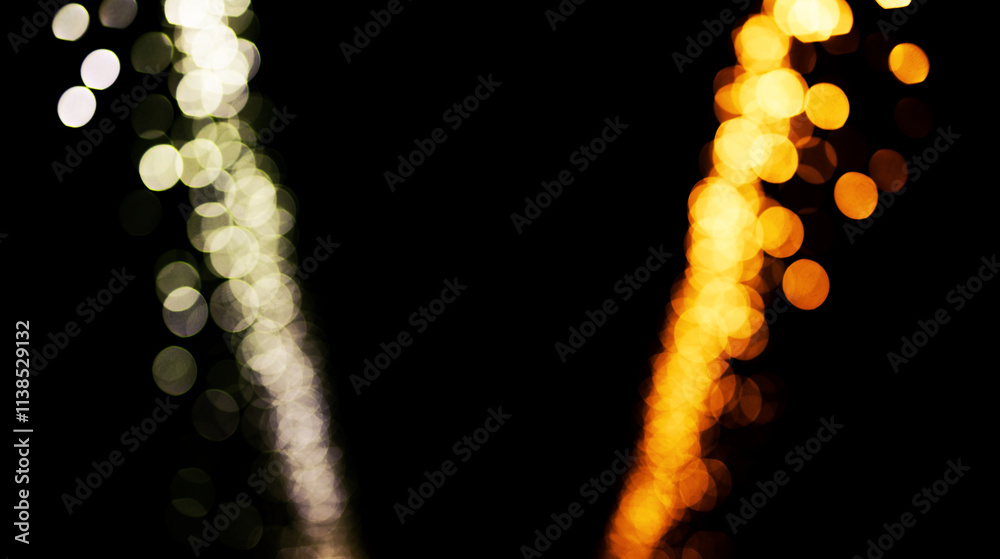 Abstract bokeh background with glowing white, orange, and yellow lights. Defocused circles and spark-like effects create a warm, festive holiday celebrations. New Year or Christmas.