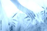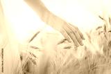 Young girl walking through field and touches wheat.