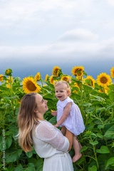 A beautiful young woman with a small child in her arms in a sunflower field.