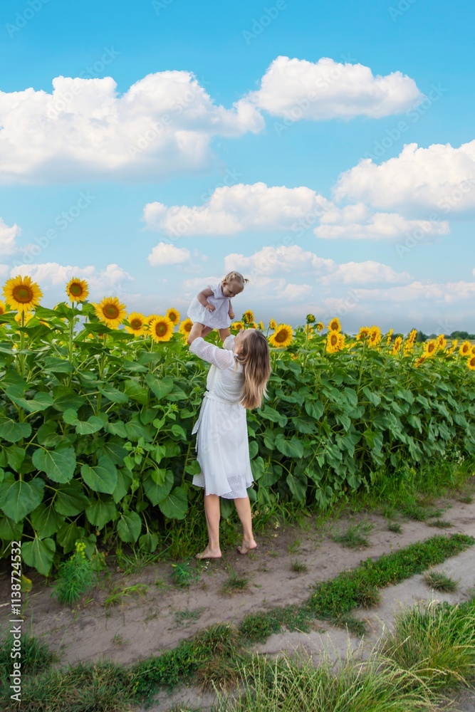A beautiful young woman with a small child in her arms in a sunflower field.