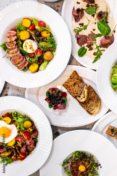 arranged table featuring a variety of gourmet dishes. Fresh salads with colorful ingredients, tender meats, and delicate garnishes, accompanied by slices of artisanal bread. Perfect for food lovers.