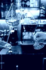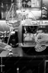 Two elegant wine glasses clink together in a toast, one filled with sparkling white wine and the other with rich red wine. The background features a stylish bar setting.