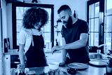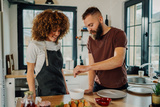 Couple cooking together in modern kitchen, adding ingredients to bowl