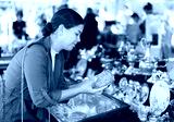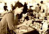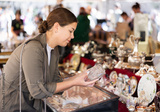 Young woman in casual clothes looking at vintage crystal flacon at flea market