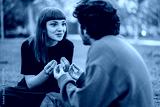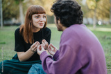 A young couple sits on the grass having a lively conversation in a park. The green, serene setting adds to the warmth of their interaction, evoking feelings of connection and understanding.