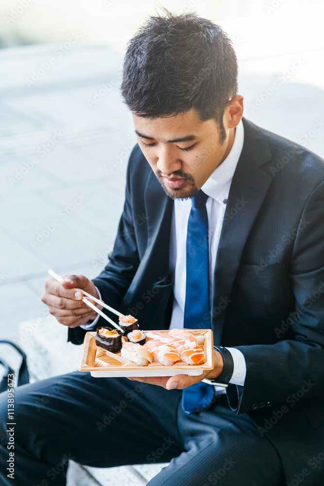 Traditional Japanese businessman in suit and tie while eating sushi on their lunch break from the seating paperwork on a stone bench