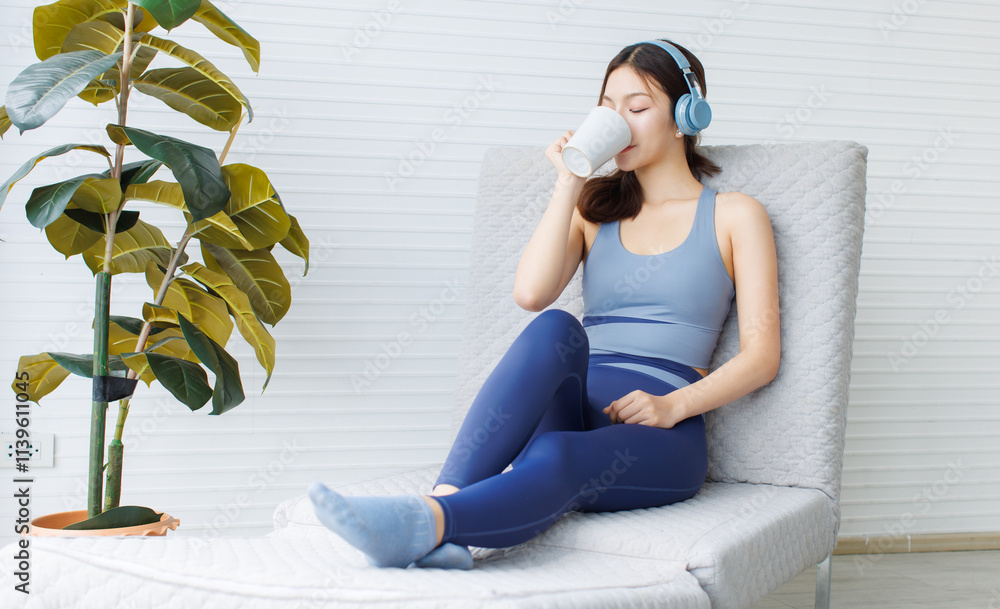 Asian young beautiful cheerful woman sporty active energetic girl in exercise sportswear and headphones listen music drink coffee in cup sitting relax on cozy sofa in living room lifestyle at home.