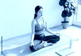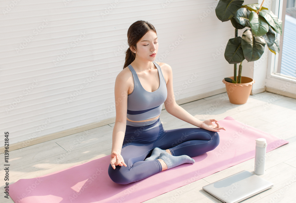 Asian young beautiful attractive woman wearing sportswear practicing yoga mat feeling contemplation meditating while online training with computer laptop in living room healthy wellness lifestyle.