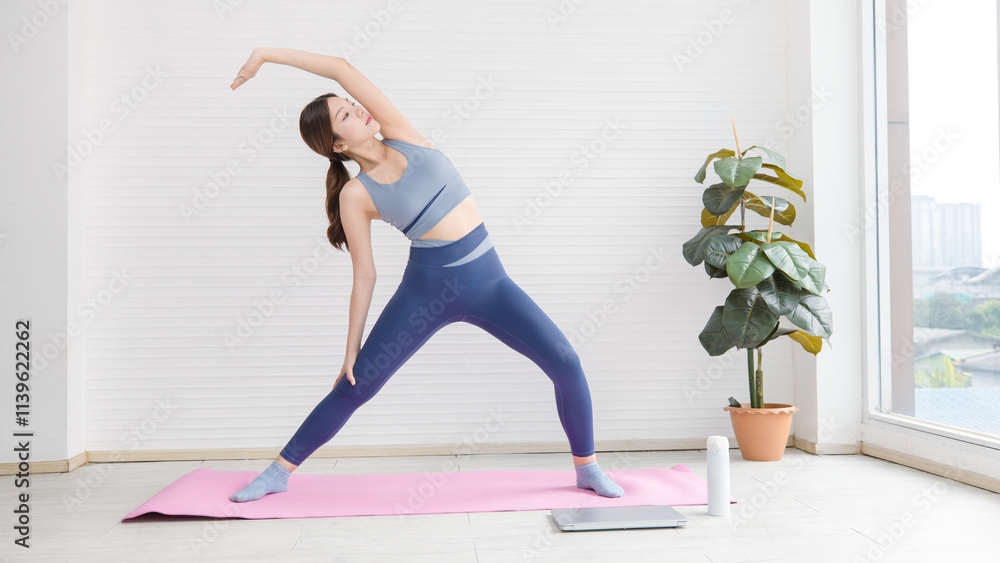 Asian young beautiful attractive woman wearing sportswear standing on mat stretching yoga body workout pilates exercise training with laptop and water bottles in living room healthy wellness lifestyle