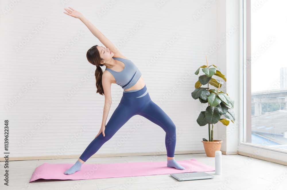 Asian young beautiful attractive woman wearing sportswear standing on mat stretching yoga body workout pilates exercise training with laptop and water bottles in living room healthy wellness lifestyle