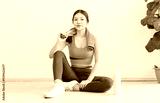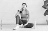 Asian young beautiful attractive woman wearing sportswear sitting on the floor, female relaxed casual break time after exercise smiling look at camera in living room, healthcare wellness lifestyle.