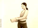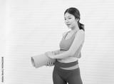 Asian young beautiful attractive woman wearing sportswear, female model holding pink yoga mat pose on white background smiling cheerful look at camera in living room, healthcare wellness lifestyle.