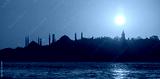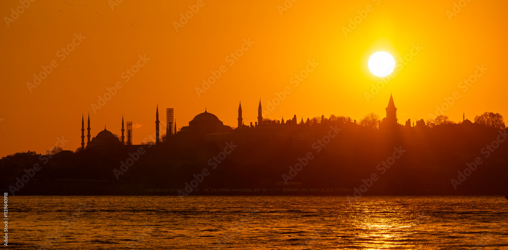 Panoramic sunset of the historical peninsula in Istanbul, silhouettes of sultanahmet mosque, hagia Sophia mosque, topkapi palace in the background,Turkey