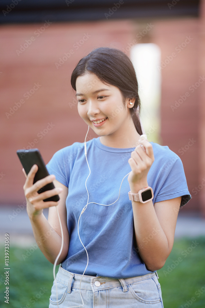 Attractive adult asian woman listening online music at outdoor