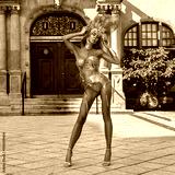 Beautiful sexy blonde model in transparent luxury vinyl erotic lingerie and high heels posing sensually in the city on summer day. Goddess.
