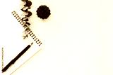 Top view copy space, desk office with laptop, blank notepad, coffee cup and pen on table, Work from home.