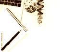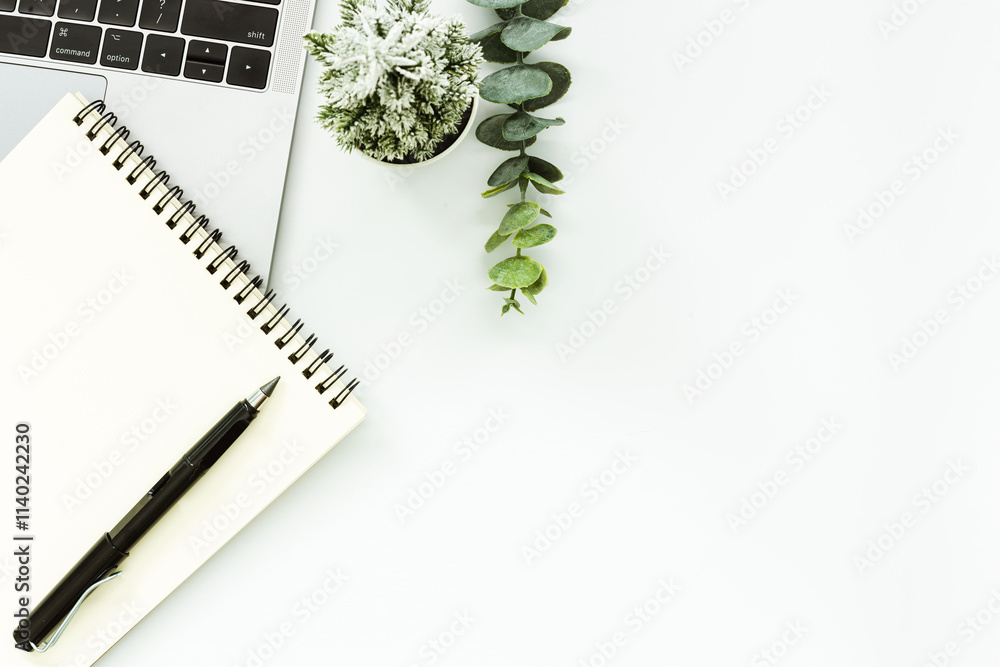 Top view copy space, desk office with laptop, blank notepad, coffee cup and pen on table, Work from home.