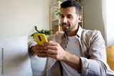 Relaxed caucasian man using smart phone at home sitting on the couch.