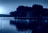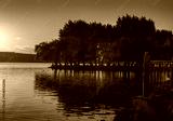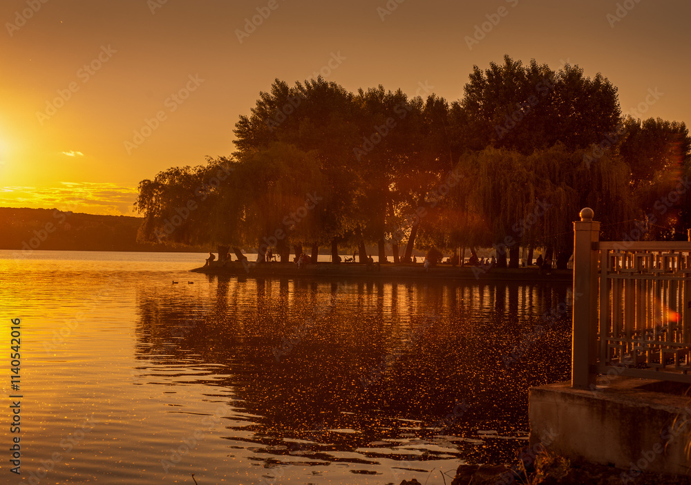 beautiful embankment of the pond with silhouettes of trees on an island in the middle of the lake, in the warm light of the sunset, Ternopil, Ukraine