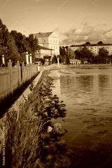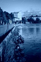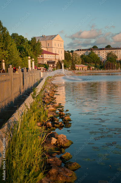 view of the embankment with the castle, silhouettes of urban buildings Ternopil, Ukraine.